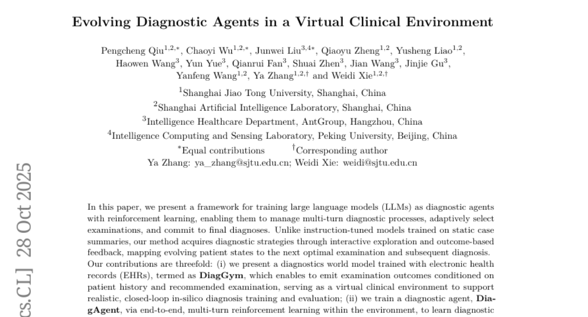 – The research introduces DiagGym, a diagnostics world model using electronic health records for training, and DiagAgent, trained with end-to-end, multi-turn reinforcement learning. Additionally, DiagBench, a benchmark of diagnostic cases, is used for evaluation.