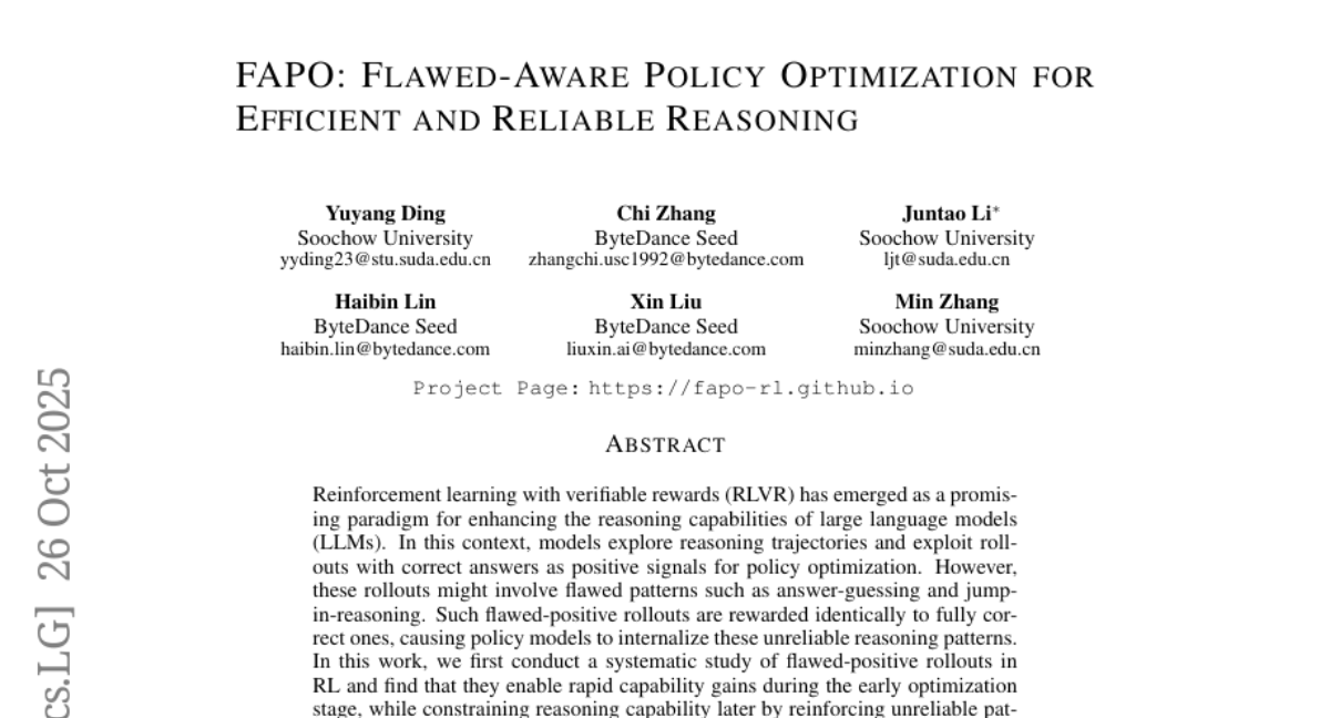 – To enhance reinforcement learning with verifiable rewards by introducing Flawed-Aware Policy Optimization (FAPO) that penalizes flawed-positive rollouts.