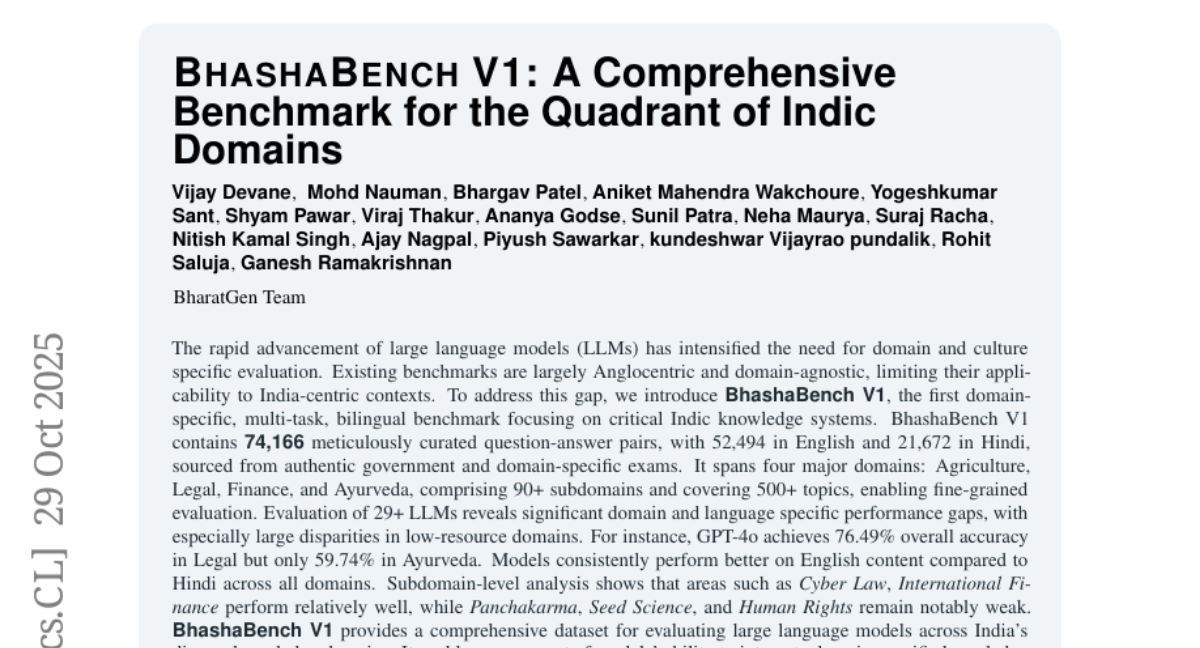 – The research aims to address the limitations of current Anglocentric and domain-agnostic benchmarks by introducing BhashaBench V1, a domain-specific, multi-task, bilingual benchmark focused on critical Indic knowledge systems.