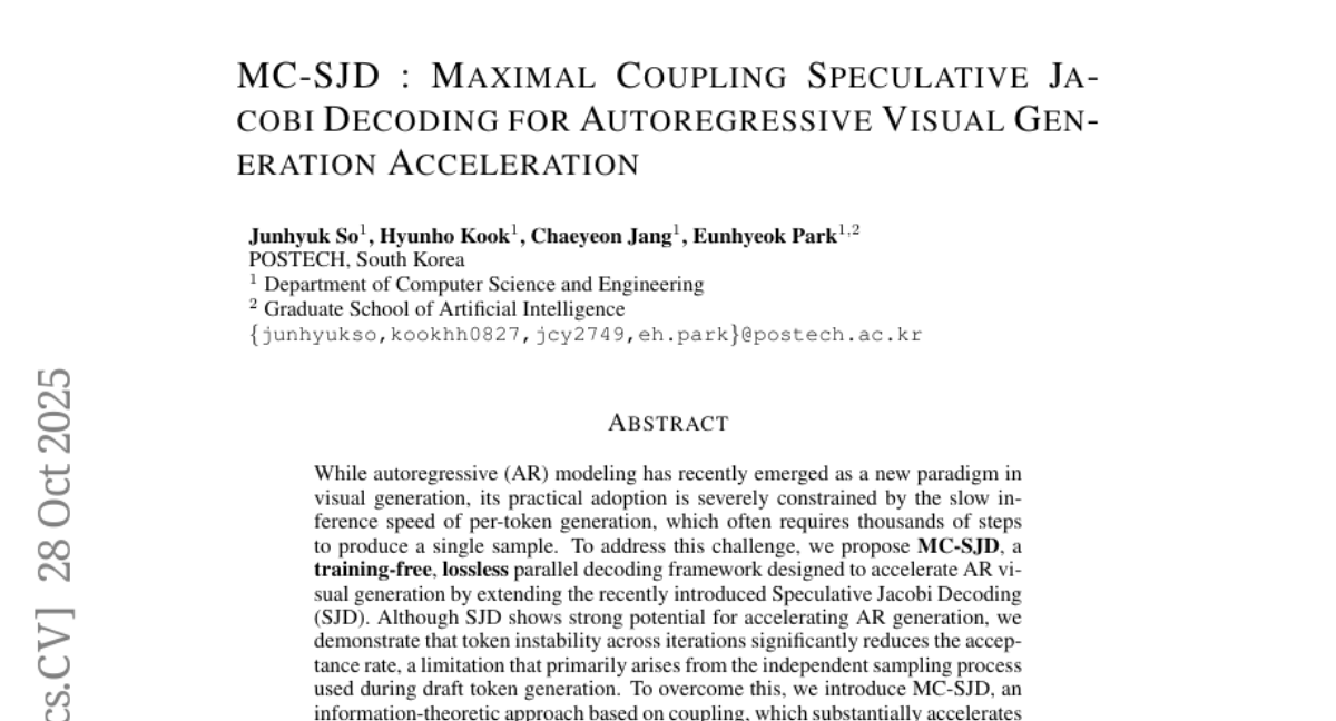 24. MC-SJD : Maximal Coupling Speculative Jacobi Decoding for Autoregressive Visual Generation Acceleration