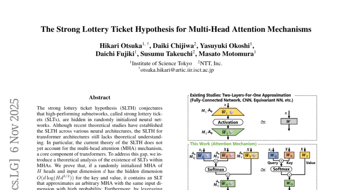 – Proven existence of high-performing subnetworks (strong lottery tickets) in randomly initialized multi-head attention models.