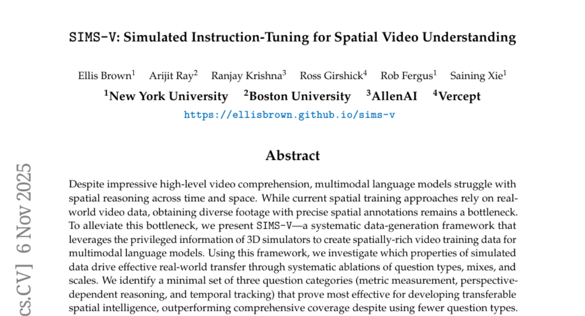 – The study aims to enhance spatial reasoning in multimodal language models using a novel data-generation framework, SIMS-V, which leverages 3D simulators to refine video training data.