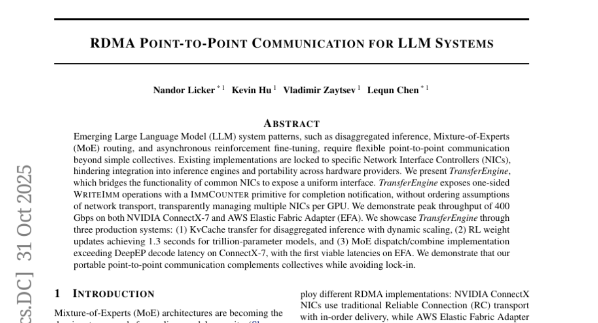 – Utilized TransferEngine to manage common NICs through a uniform interface that supports disaggregated inference, reinforcement learning, and Mixture-of-Experts routing.