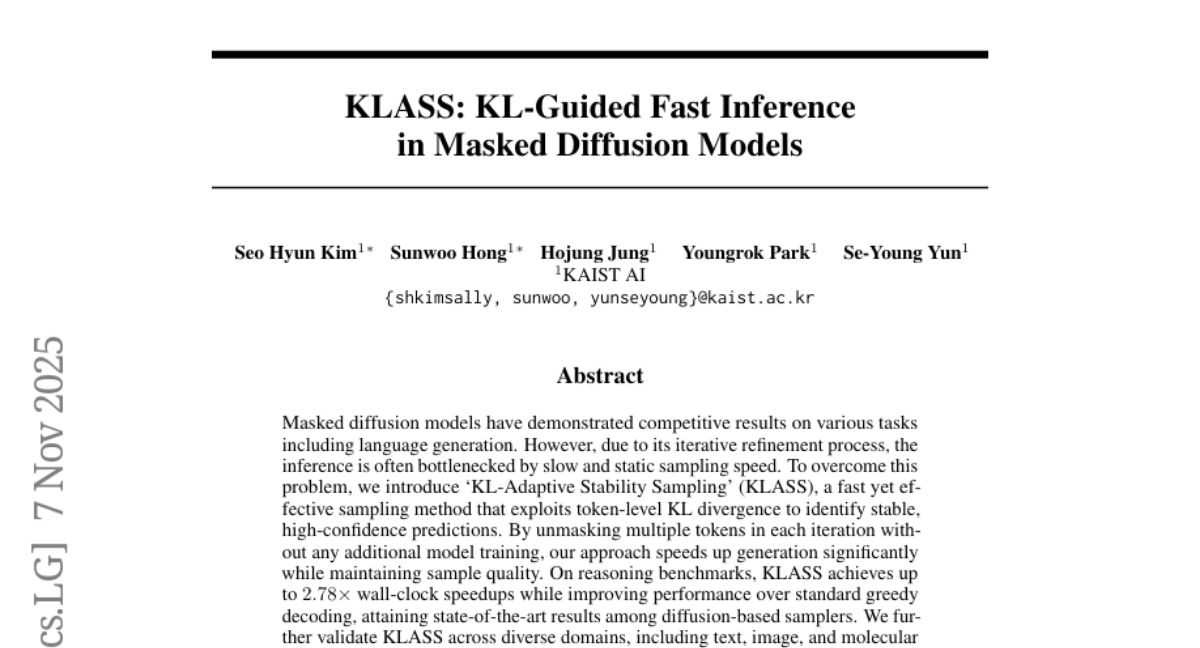 – KLASS achieves up to 2.78 times speedup over traditional methods while enhancing performance on reasoning benchmarks, with applicability across text, image, and molecular generation.