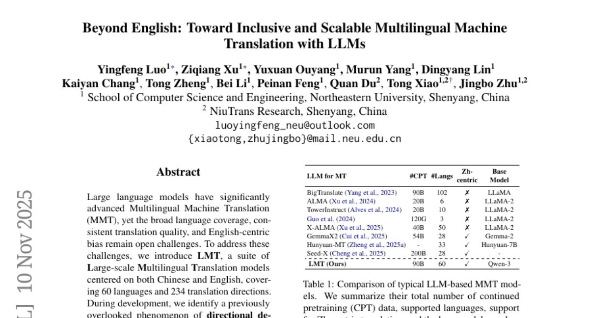 – LMT achieves state-of-the-art performance across 60 languages and 234 translation directions, with the 4B model significantly outperforming larger models like Aya-101-13B and NLLB-54B, offering strong baselines for future multilingual machine translation research.