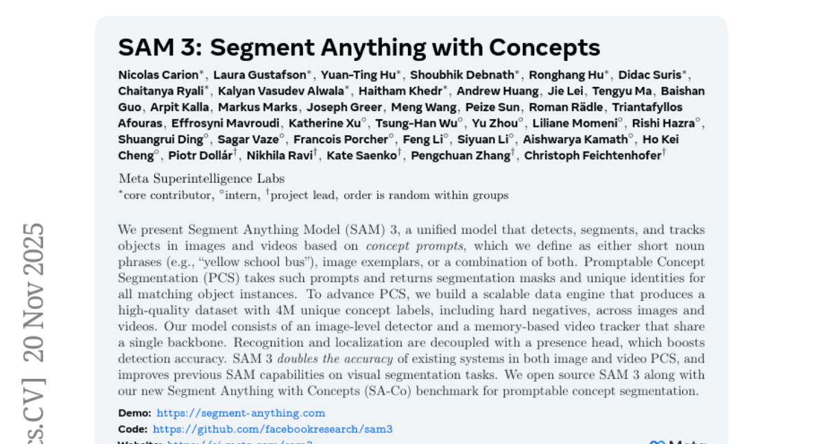 ๐Ÿ”‘ Keywords: Segment Anything Model, concept prompts, Promptable Concept Segmentation, scalable data engine, visual segmentation
