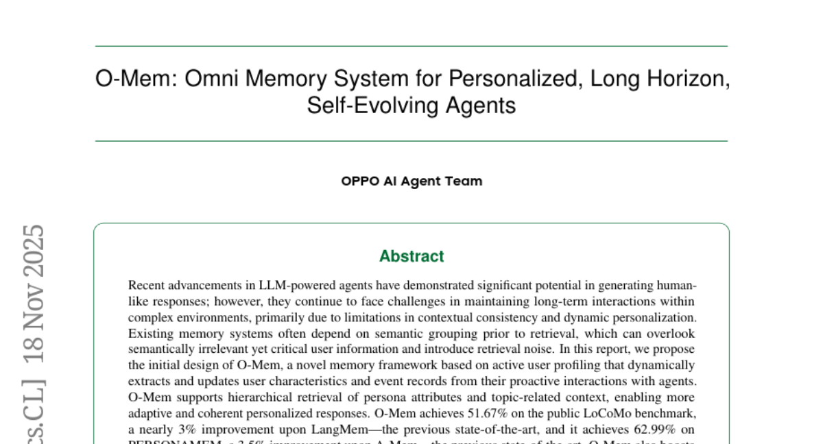 – To develop O-Mem, a novel memory framework that enhances contextual consistency and dynamic personalization in LLM-powered agents.