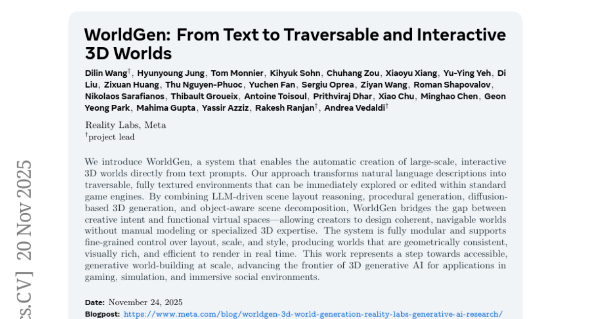 – To introduce WorldGen, a system for creating large-scale, interactive 3D worlds from text prompts utilizing LLM-driven reasoning and other advanced techniques.