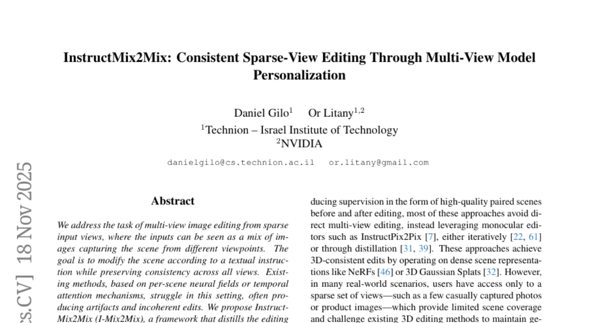 – To enhance multi-view image editing using a framework called InstructMix2Mix, which introduces cross-view consistency through a 3D prior.