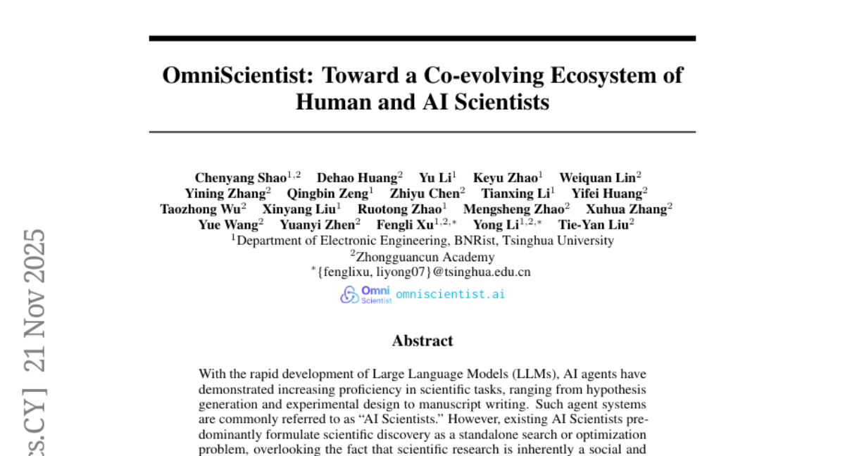 – Introduces OmniScientist, a framework that encodes human research mechanisms into AI workflows, providing end-to-end automation and comprehensive infrastructural support for scientific tasks.
