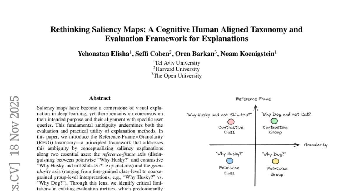 – The paper introduces the Reference-Frame ร— Granularity (RFxG) taxonomy to organize saliency explanations and align them with user intent in deep learning.