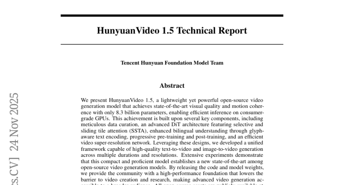 – HunyuanVideo 1.5 establishes a new state-of-the-art in open-source video generation, offering high-performance capabilities on consumer-grade GPUs and accessible advanced video generation to a broader audience.
