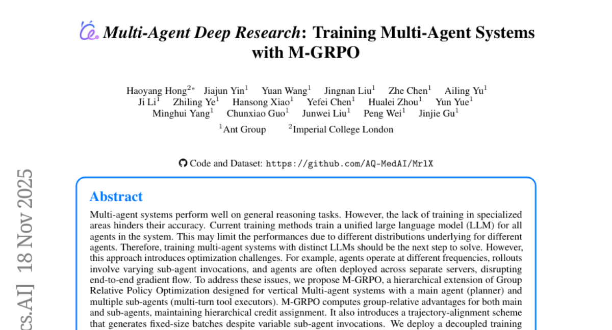 – The introduction of M-GRPO to enhance stability and efficiency in hierarchical multi-agent systems, particularly in tool-augmented reasoning tasks.
