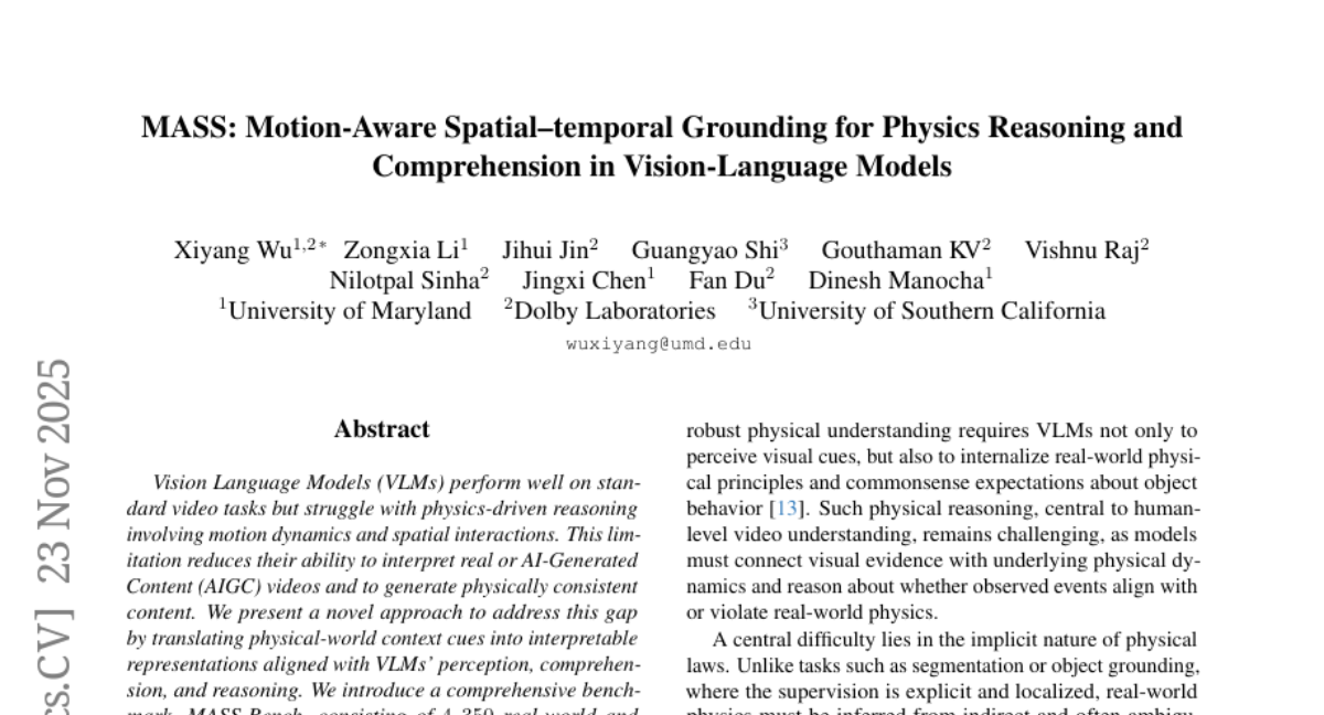 – Developed a benchmark called MASS-Bench with 4,350 videos and 8,361 question-answer pairs focusing on physics comprehension.