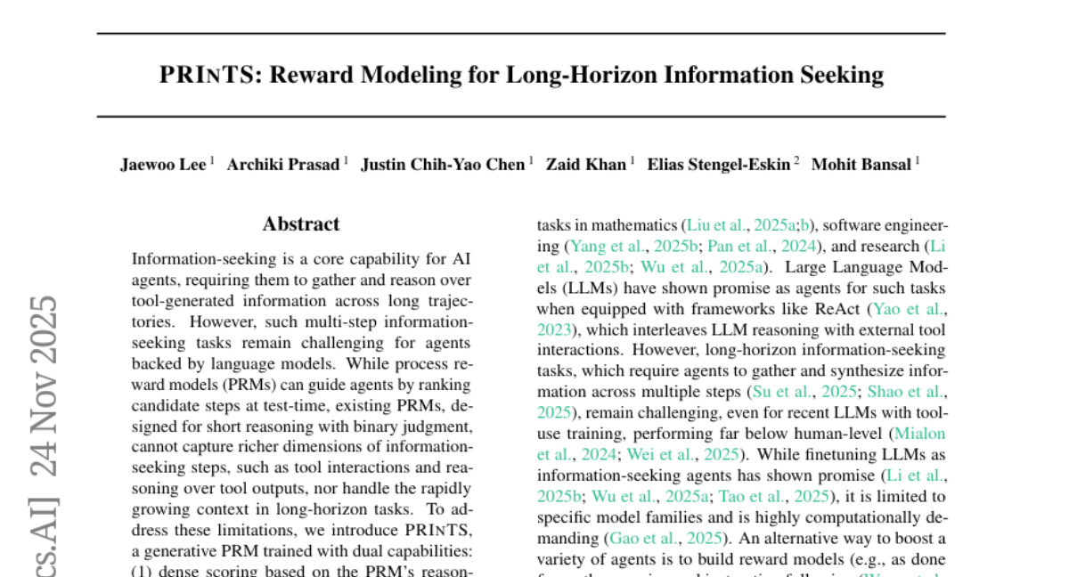– Extensive evaluations demonstrate that PRInTS improves the information-seeking capabilities of AI agents, matching or surpassing the performance of frontier models with smaller backbones, outperforming existing strong reward modeling baselines.