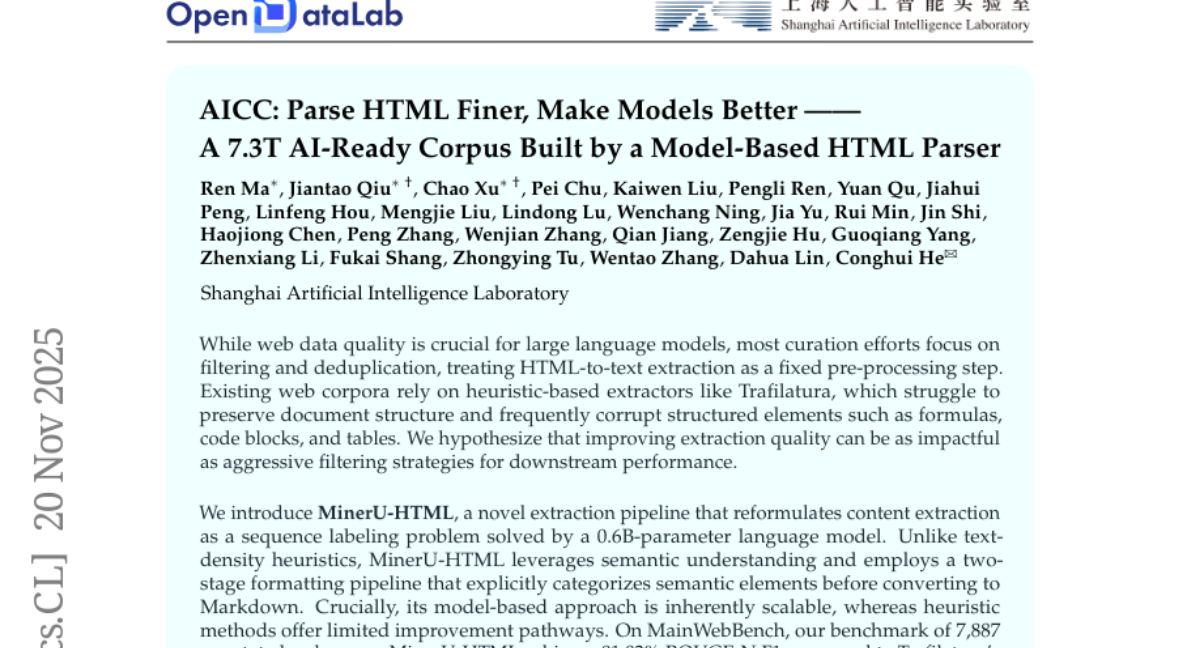 – MinerU-HTML is developed as a novel extraction pipeline that treats content extraction as a sequence labeling problem, utilizing a 0.6B-parameter language model with semantic understanding for improved document structure preservation.