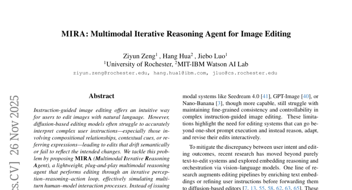– The study introduces MIRA which utilizes an iterative perception-reasoning-action loop for editing, making use of visual feedback, and is trained with a multimodal tool-use dataset, MIRA-Editing, combined with a two-stage SFT + GRPO training pipeline.