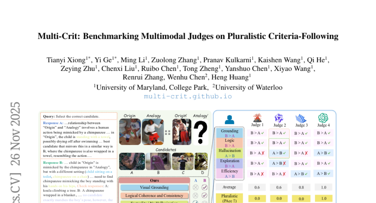 – Proprietary models struggle with pluralistic criteria adherence, especially in open-ended evaluations, while open-source models further lag in flexibility. Critic fine-tuning improves visual grounding but not criterion-level judgment, thus highlighting limitations in current multimodal judges.