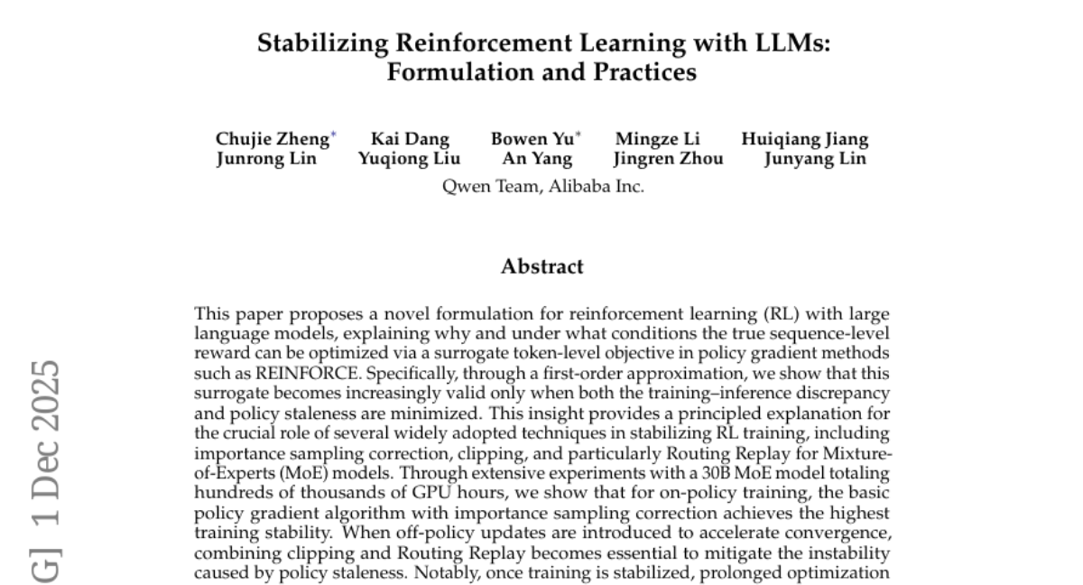 – Conducts extensive experiments with a 30 billion parameter Mixture-of-Experts model to assess training stabilization techniques in both on-policy and off-policy updates.