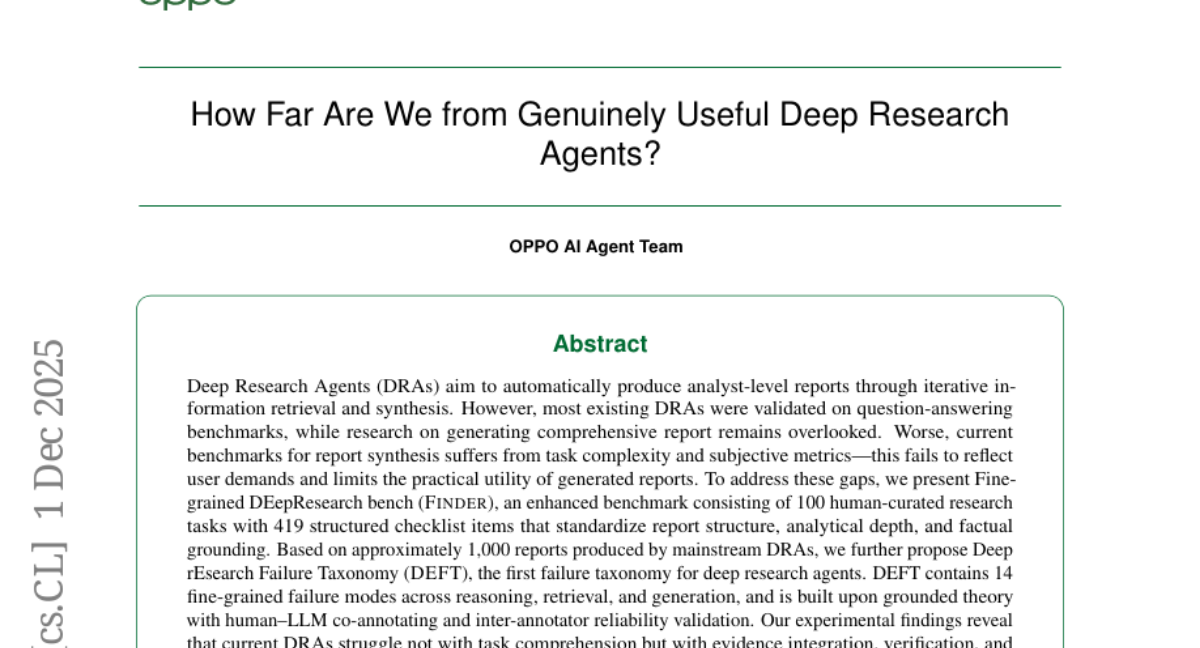 – The objective of this research is to improve the effectiveness of Deep Research Agents (DRAs) by introducing a new benchmark called FINDER, designed to address existing limitations in task complexity and subjective metrics for report synthesis.