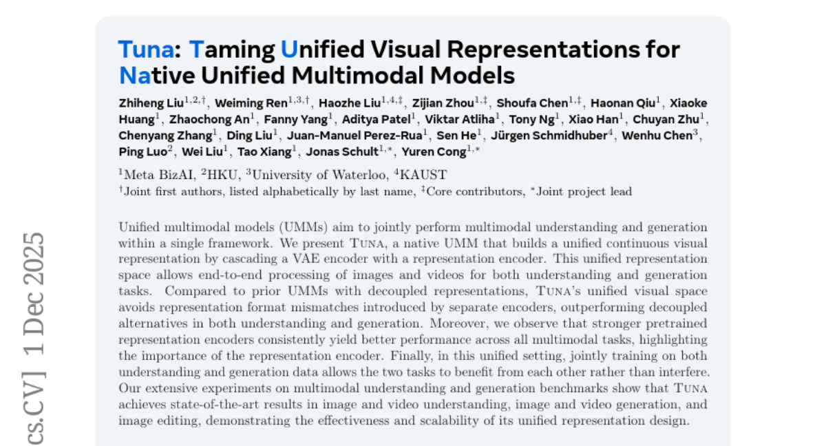 – TUNA’s unified representation space enhances performance by avoiding format mismatches and benefits from stronger pretrained representation encoders, achieving state-of-the-art results in multimodal tasks including image and video understanding, generation, and editing.