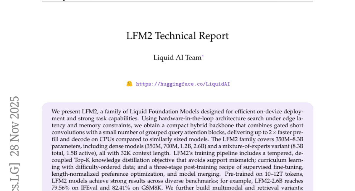 – The study presents the LFM2 family of Liquid Foundation Models designed for efficient on-device deployment, accommodating multimodal tasks with high efficiency and performance.