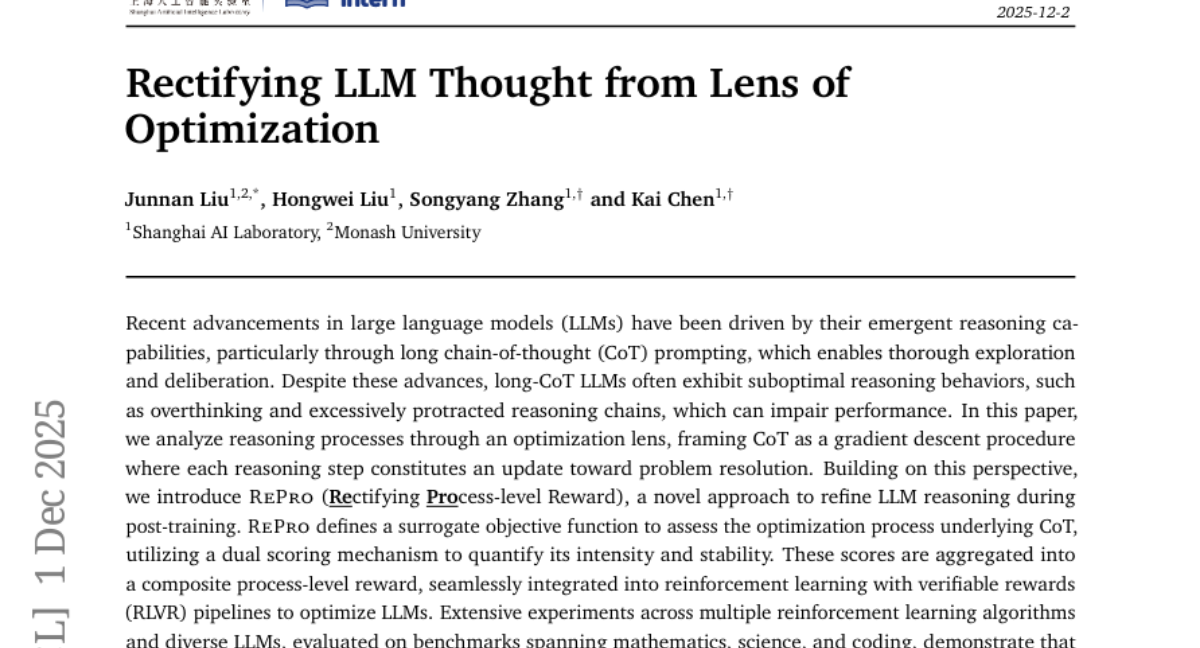 – RePro introduces a surrogate objective function with a dual scoring mechanism to quantify the intensity and stability of the optimization process in chain-of-thought reasoning. This approach is integrated into reinforcement learning pipelines with verifiable rewards.