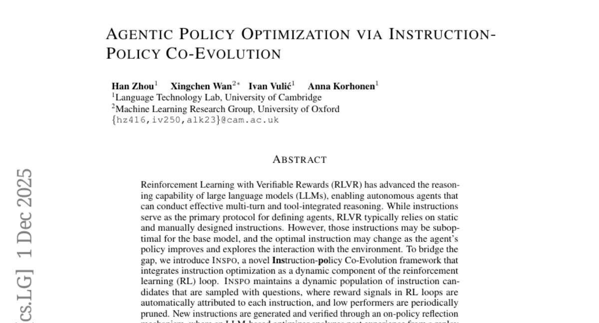 – INSPO integrates instruction optimization as a dynamic element of the reinforcement learning process. It maintains a dynamic population of candidate instructions, applying reward signals and on-policy reflection to evolve more effective strategies through an LLM-based optimizer.