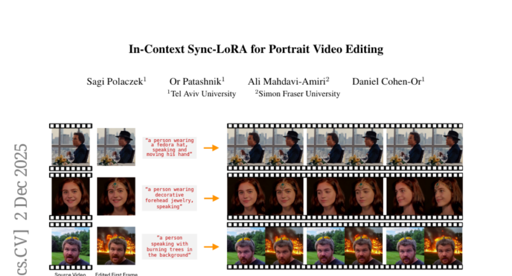 – Sync-LoRA utilizes an image-to-video diffusion model trained with in-context LoRA. It involves modifying the first frame, then propagating edits throughout the video, with training on a curated set of synchronized human portraits.