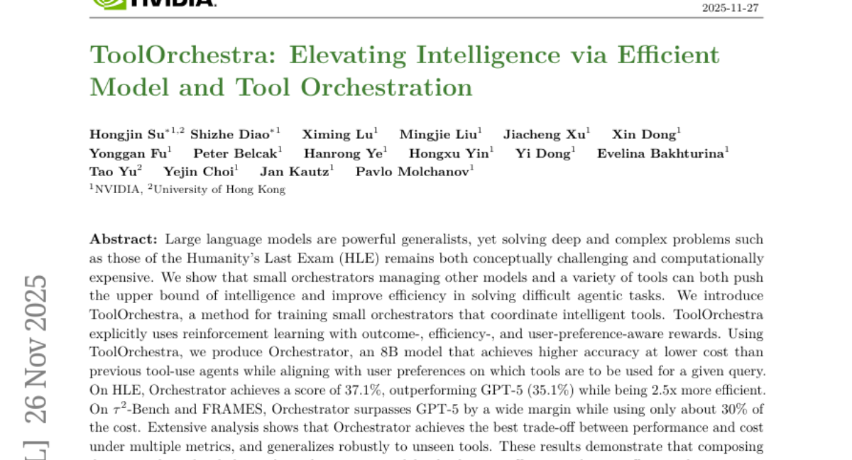 – The paper introduces ToolOrchestra, a method for training small orchestrators that coordinate intelligent tools to enhance efficiency and accuracy in solving complex tasks like Humanity’s Last Exam.