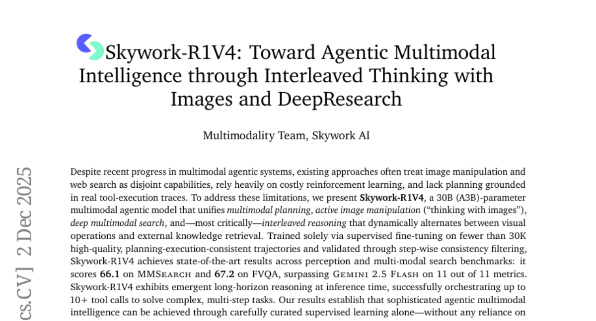 – Skywork-R1V4 achieves state-of-the-art performance in perception and multimodal search benchmarks, demonstrating sophisticated multimodal intelligence and successful orchestration of complex multi-step tasks. The model exceeds performance metrics compared to existing systems, particularly Gemini 2.5 Flash.