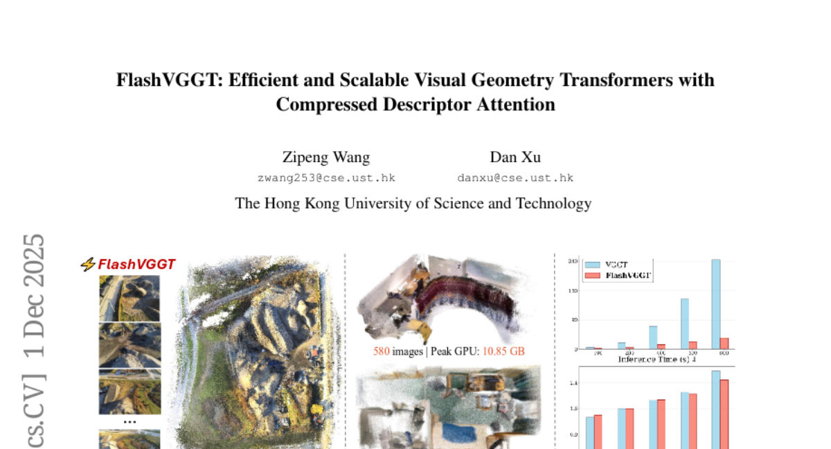 – Introduce FlashVGGT, an efficient model utilizing descriptor-based attention for 3D reconstruction to improve scalability and reduce inference time compared to VGGT.