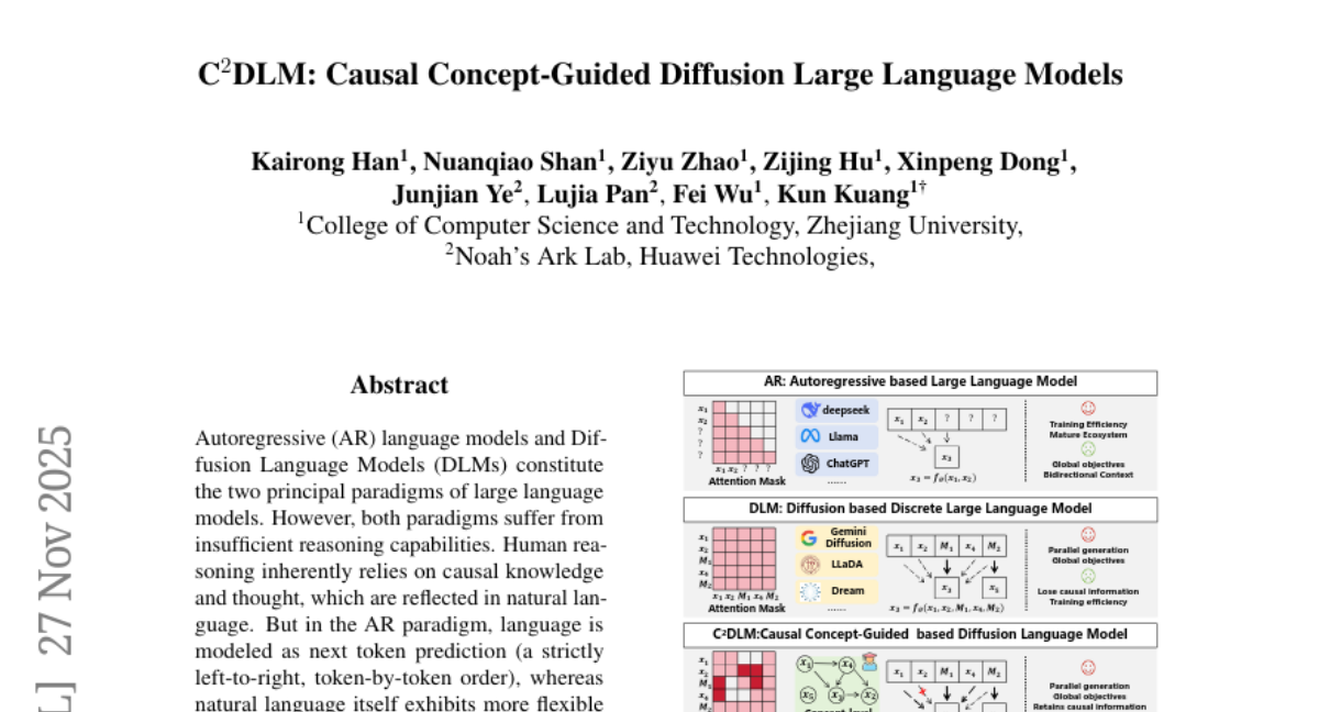 ๐ Keywords: Causal Concept-Guided Diffusion Language Model (C^2DLM), Diffusion Language Models (DLMs), causal relationships, training efficiency, reasoning tasks