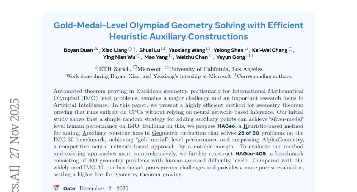 – Implementation of HAGeo, a heuristic-based method for adding auxiliary constructions in geometric deduction, which operates efficiently on CPUs.