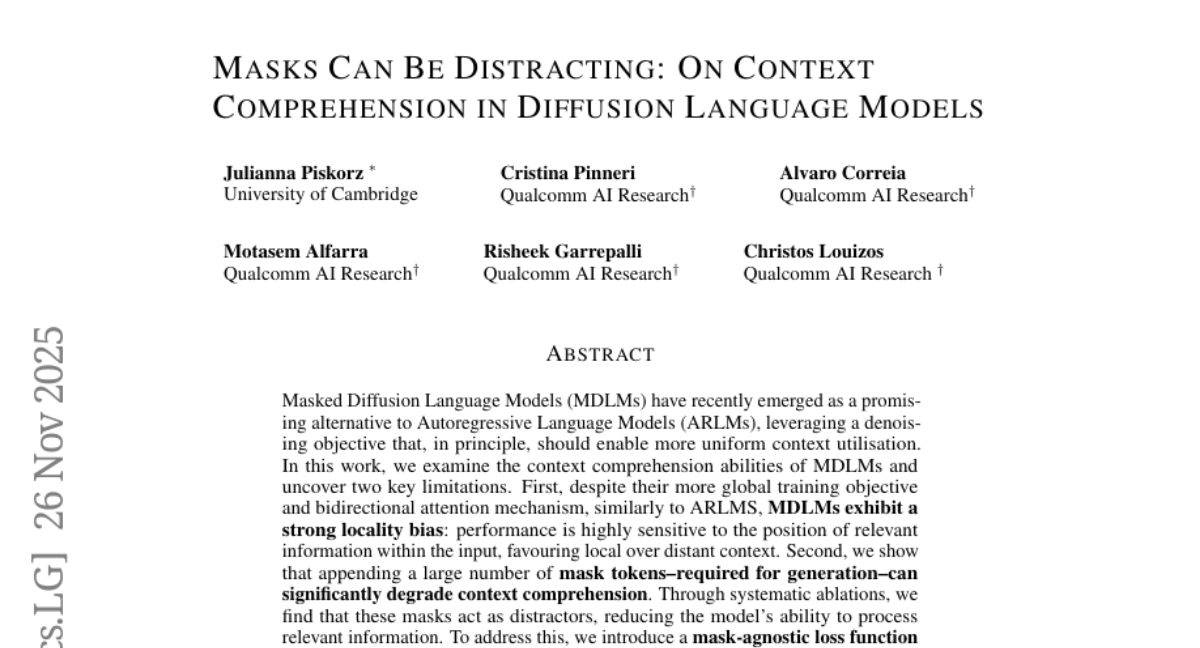 – Despite a global training objective, MDLMs show strong locality bias. Adding mask tokens degrades context comprehension. Introducing a mask-agnostic loss function significantly enhances robustness and context comprehension abilities.