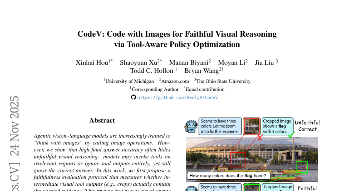 – The paper aims to improve faithful tool use and accuracy in visual and multimodal reasoning tasks through the use of a new code-based visual agent called CodeV.