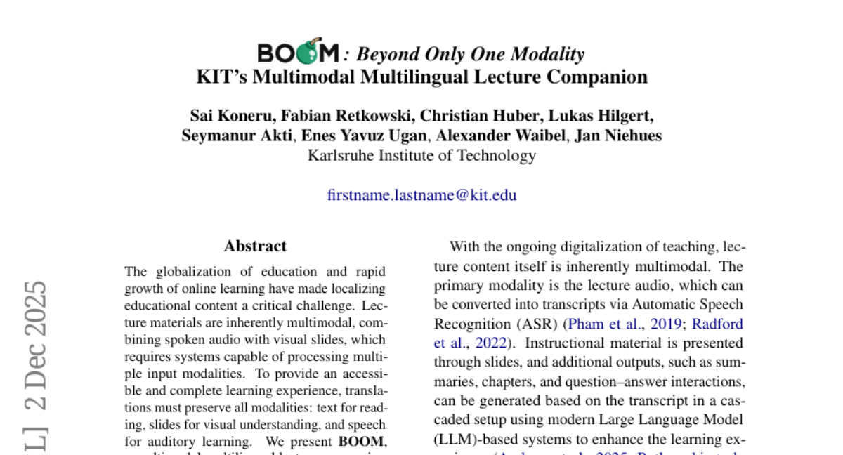 – The research aims to address the challenge of localizing educational content by developing BOOM, a multimodal multilingual lecture companion that translates audio and slides to produce synchronized outputs.