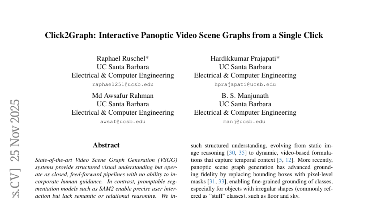 – Click2Graph demonstrates a robust foundation for user-guided PVSG, effectively integrating human prompting with panoptic grounding and relational inference for controllable and interpretable video scene understanding.