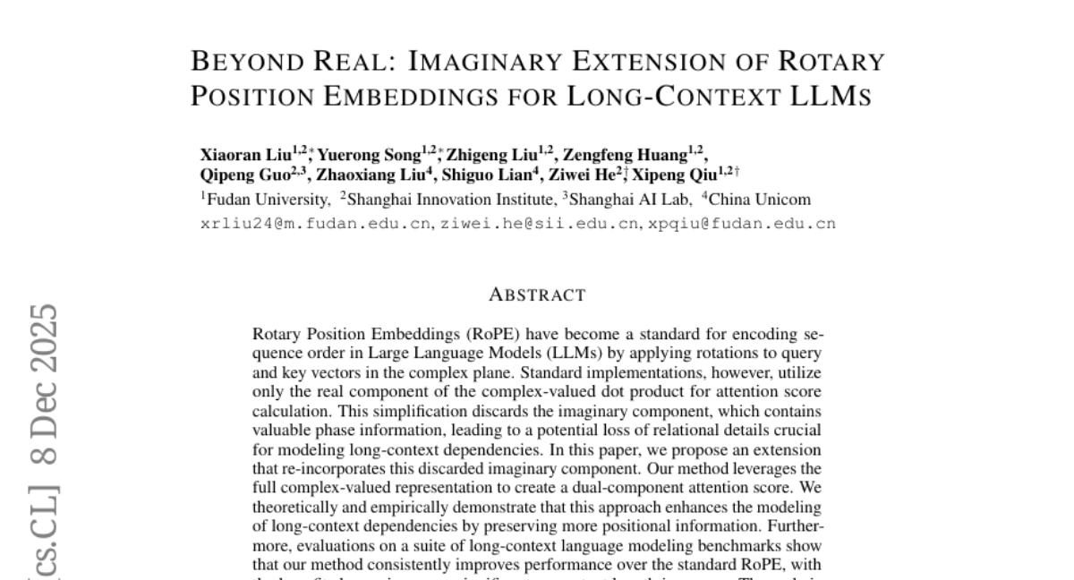 – The paper aims to enhance Rotary Position Embeddings by integrating both real and imaginary components of the complex-valued dot product to improve long-context modeling in Large Language Models.