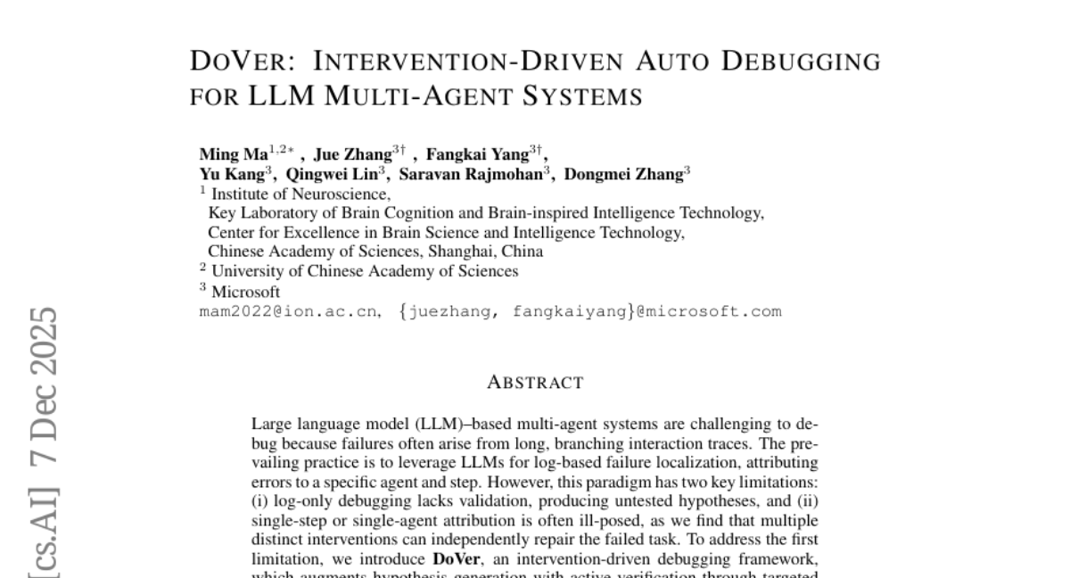 – The introduction of DoVer, an intervention-driven debugging framework, which augments hypothesis generation with active verification through targeted interventions, such as editing messages and altering plans.