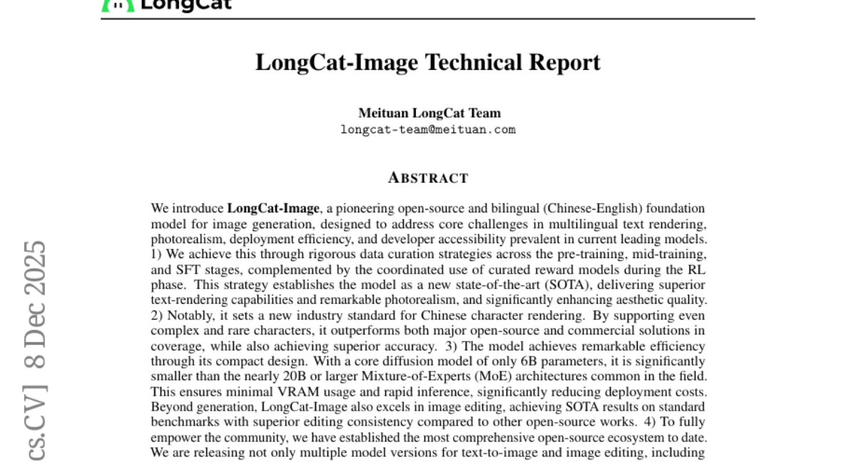 – Introduce LongCat-Image, a bilingual Chinese-English open-source foundation model for image generation addressing issues in multilingual text rendering, photorealism, deployment efficiency, and accessibility for developers.