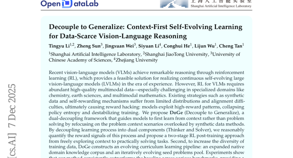 – To enhance vision-language models by separating context learning from problem solving, improving reward signals and data diversity.