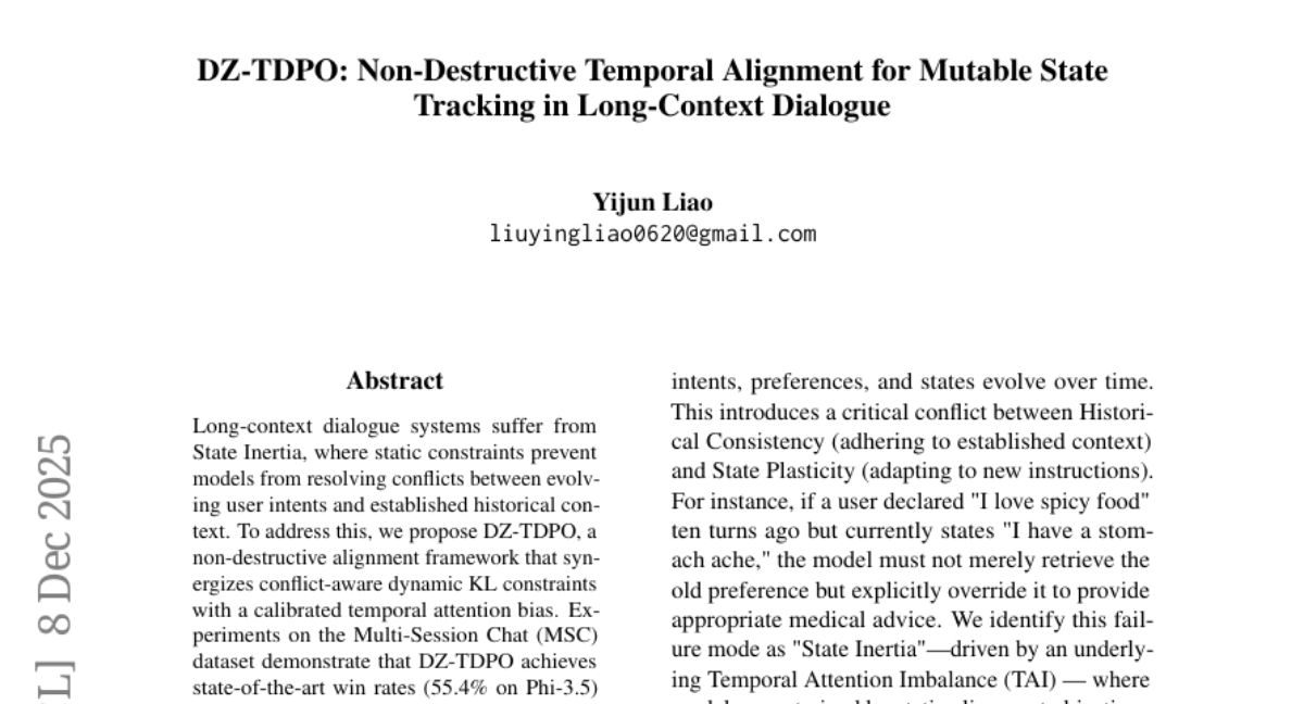 – To enhance long-context dialogue systems by resolving user intent conflicts using the DZ-TDPO framework that combines dynamic KL constraints with temporal attention bias.