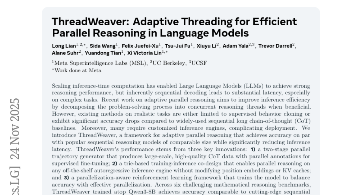– The paper introduces ThreadWeaver, a framework designed to achieve high accuracy in adaptive parallel reasoning while significantly reducing inference latency.