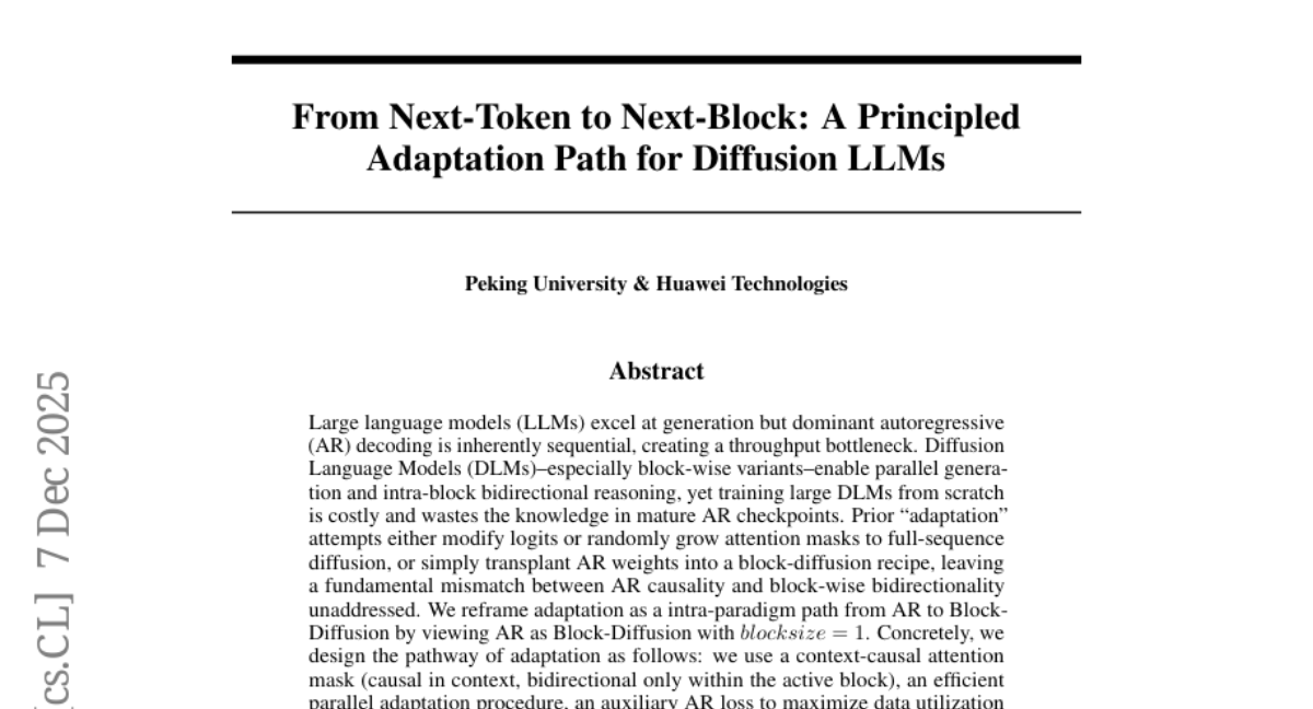 – The research aims to adapt autoregressive models to block-wise diffusion to enable parallel generation while retaining pretrained knowledge, thus achieving superior performance in 7B-class diffusion language models.