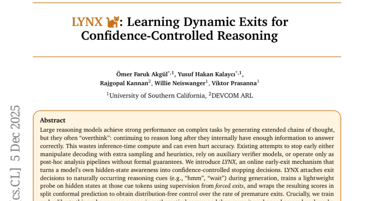 – LYNX attaches exit decisions to naturally occurring reasoning cues during the model’s generation process. A lightweight probe is trained on hidden states with supervision from forced exits, and scores are wrapped in split conformal prediction for distribution-free control over premature exits.