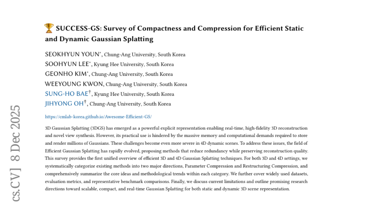 – The survey aims to provide a unified overview of efficient 3D and 4D Gaussian Splatting techniques focusing on memory and computational efficiency while maintaining reconstruction quality.