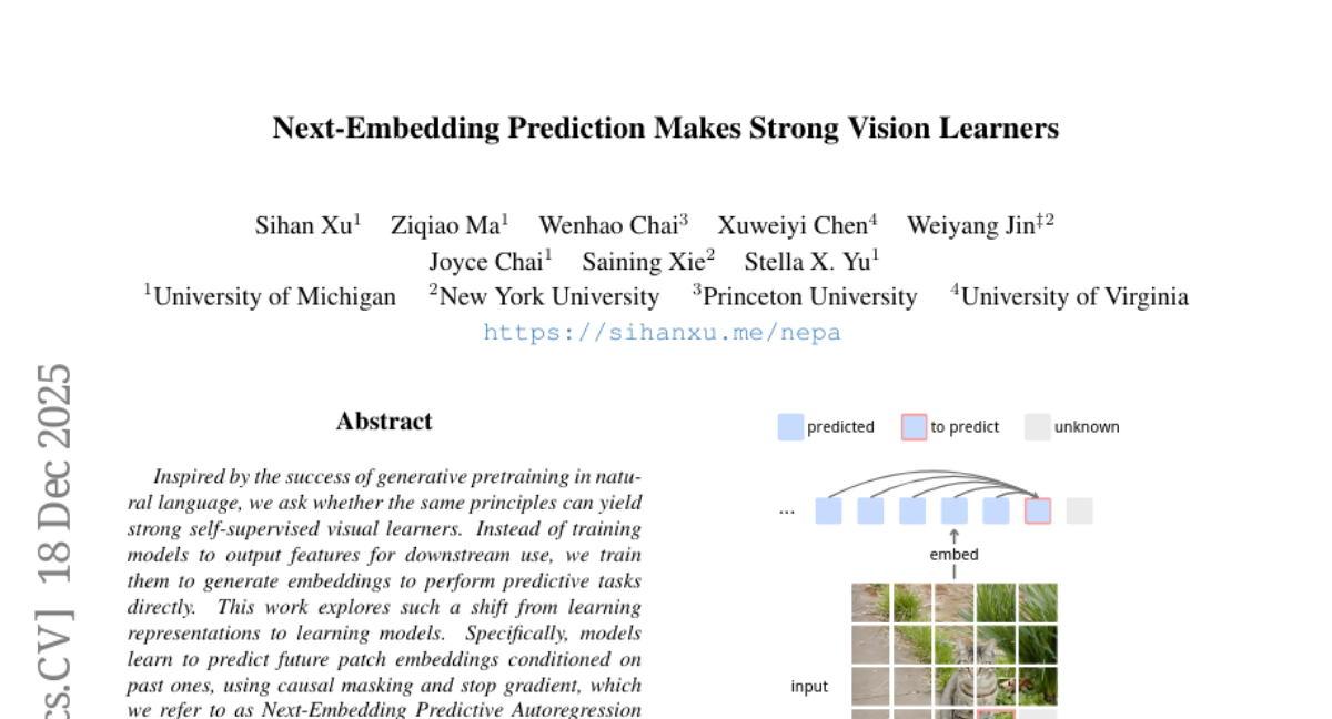 ๐ Keywords: Generative pretraining, Next-Embedding Predictive Autoregression (NEPA), causal masking, ImageNet, semantic segmentation
