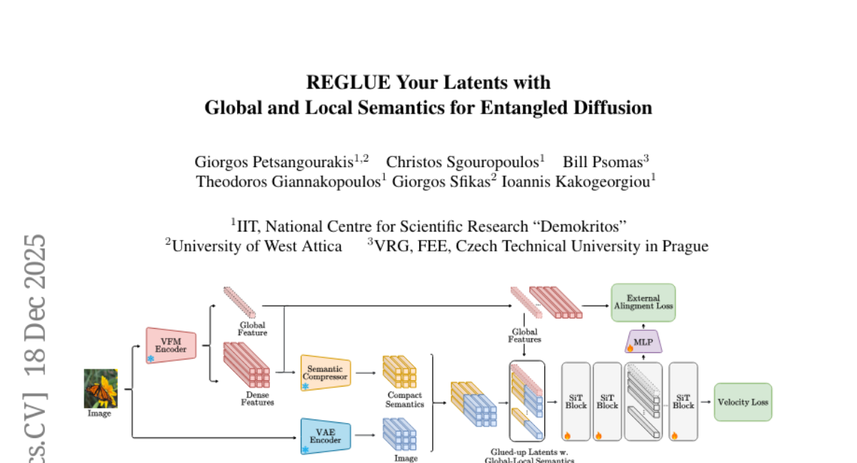 – To enhance image synthesis by introducing REGLUE, a unified latent diffusion framework that improves semantic supervision and convergence through joint modeling of VAE latents, patch-level VFM semantics, and global tokens.