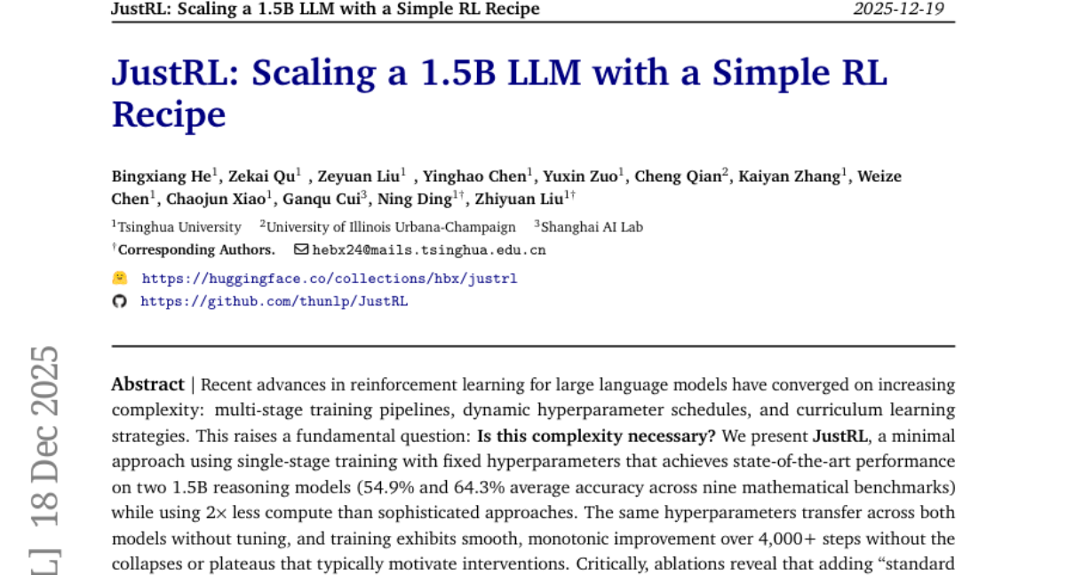 ๐ Keywords: JustRL, Reinforcement Learning, Large Language Models, Single-Stage Training, Fixed Hyperparameters